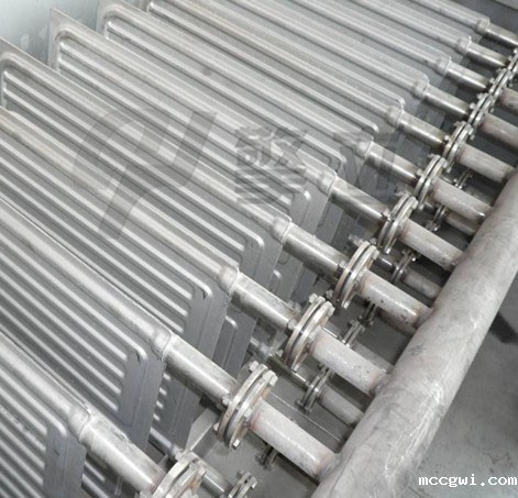 波纹板热交换器(沉浸式板式换热器)是一种新颖沉浸式板状热交换热器,它是由两块特殊传热构造壁板组合成传热单元。槽内波纹板热交换器具有合理的空间结构,良好的传热效率和排凝效果,换热模块化单元结构、串并联组合简捷方便、运行性能可靠,是目前热传递领域中一种新型传热单元模块。