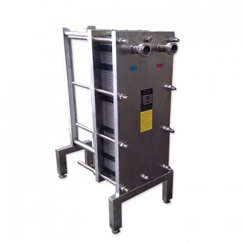 板式热交换器是由一组波纹金属板组成,板上有四个角孔,供传热的两种液体通过。金属板片安装在一个侧面有固定板和活动压紧板的框架内,并用夹紧螺栓夹紧。板片上装有密封垫片,将流体通道密封,并且引导流体交替地流至各自的流道内,形成热交换。流体的流量,物理性质,压力降和温度差决定了板片的数量和尺寸。波纹板不仅提高了湍流程度,并且形成许多支承点,足以承受介质间的压力差。 金属板和活动板压紧板悬挂在上导杆,并由下导杆定位,而杆端则固定在支撑柱上。但其中一种液体或两种液体在换热器不止通过一次,则接口应开在固定板和活动压紧板上 |