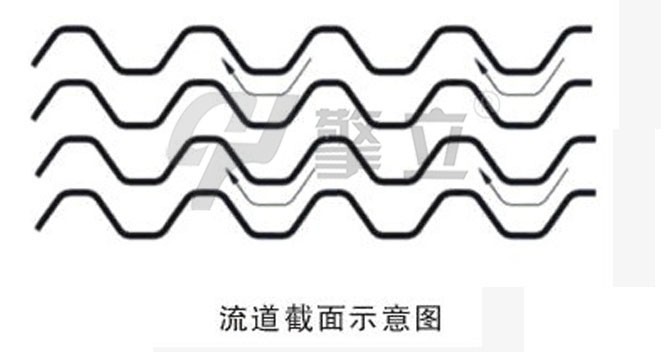传热板表面几何曲面设计,有效地提高了流体运动中的传热因素——流体紊动率。减少流体边界层热阻,促使热流体向全面传递,从而强化传热效率。