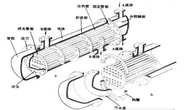 换热器的一块管板用法兰与外壳相连接,另一块管板不与外壳连接,以使管子受热或冷却时可以自由伸缩,但在这块管板上连接一个顶盖,称之为“浮头”,所以这种换热器叫做浮头式换热器。其优点是:管束可以拉出,以便清洗;管束的膨胀不变壳体约束,因而当两种换热器介质的温差大时,不会因管束与壳体的热膨胀量的不同而产生温差应力。其缺点为结构复杂,造价高。
