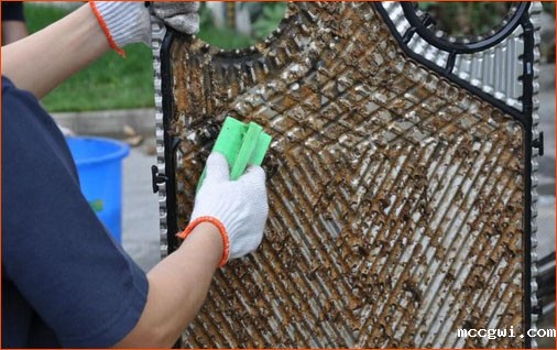 严重时还会堵塞板片通道。板式换热器的板片设计有大量的支承点,结垢可导致传热设备的传热系数降低.旨在对介质起扰流(使介质紊流以提高传热系数)和承压支承作用,固体杂物容易集聚的地方,其副作用是使流体形成了局部的滞流而生成污垢积瘤,介质中的钙镁离子在适宜的温度析出后很容易积瘤上附着长大,形成蜂窝状的垢样。