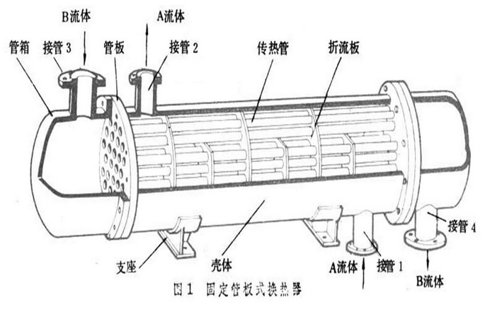 图1[固定管板式换热器]为固定管板式换热器的构造。A流体从接管1流入壳体内,通过管间从接管2流出。B流体从接管3流入,通过管内从接管4流出。如果A流体的温度高于B流体,热量便通过管壁由A流体传递给B流体;反之,则通过管壁由B流体传递给A流体。壳体以内、管子和管箱以外的区域称为壳程,通过壳程的流体称为壳程流体(A流体)。管子和管箱以内的区域称为管程,通过管程的流体称为管程流体(B流体)。管壳式换热器主要由管箱、管板、管子、壳体和折流板等构成。通常壳体为圆筒形;管子为直管或U形管。为提高换热器的传热效能,也可采用螺纹管、翅片管等。管子的布置有等边三角形、正方形、正方形斜转45°和同心圆形等多种形式,前3种最为常见。按三角形布置时,在相同直径的壳体内可排列较多的管子,以增加传热面积,但管间难以用机械方法清洗,流体阻力也较大。管板和管子的总体称为管束。管子端部与管板的连接有焊接和胀接两种。在管束中横向设置一些折流板,引导壳程流体多次改变流动方向,有效地冲刷管子,以提高传热效能,同时对管子起支承作用。折流板的形状有弓形、圆形和矩形等。为减小壳程和管程流体的流通截面、加快流速,以提高传热效能,可在管箱和壳体内纵向设置分程隔板,将壳程分为2程和将管程分为2程、4程、6程和8程等。管壳式换热器的传热系数,在水-水换热时为1400~2850瓦每平方米每摄氏度〔W/(m(℃)〕;用水冷却气体时,为10~280W/(m(℃);用水冷凝水蒸汽时,为570~4000W/(m(℃)。