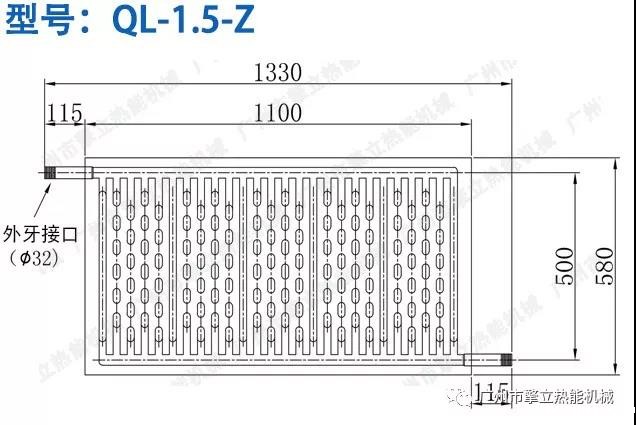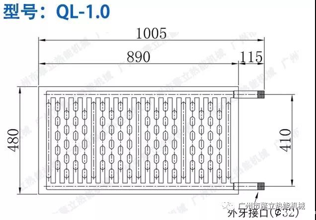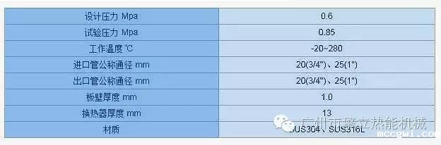 沉浸式换热器整体热力结构是根据矩形板壳瓦楞扩展传热原理,传热板表面曲面系数有效地提高了流体运动中的传热要素—流体紊动率,减少流体边界层热阻和温度梯度,促使流体向全平面传递,从而强化传热效率。技术参数